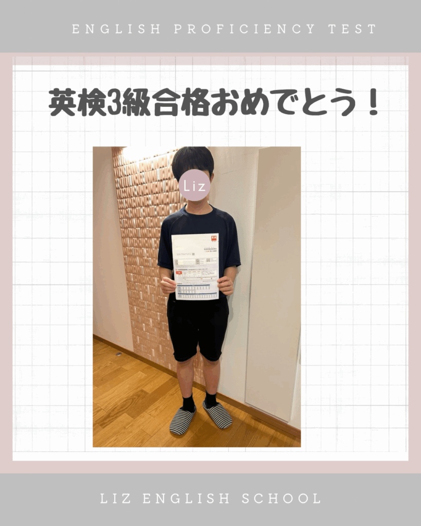 いつも定期テストで高得点をキープしているK君。英検3級は、ライティングで少しアドバイスをしただけで、ほぼ対策なしで合格しました💮